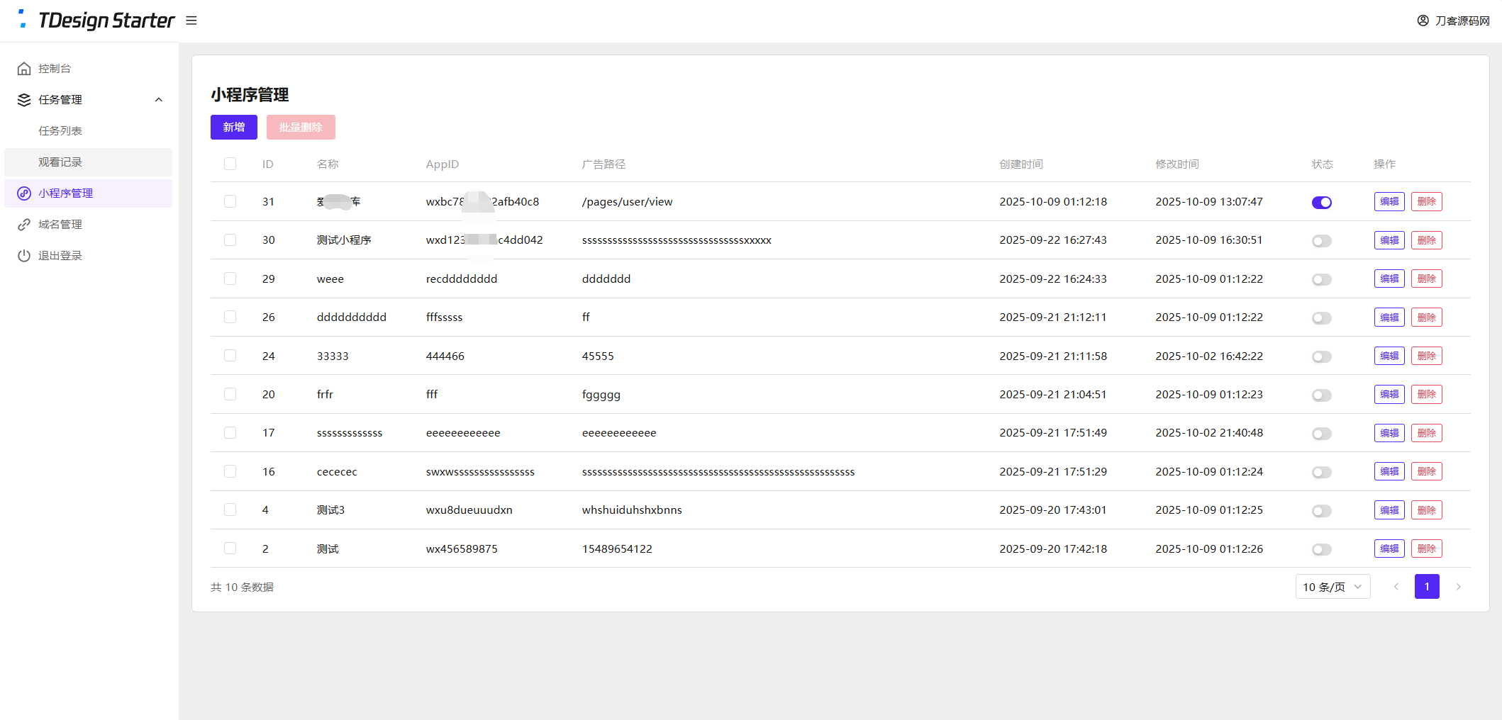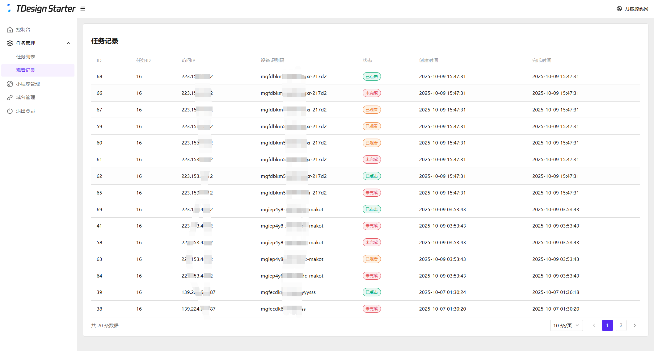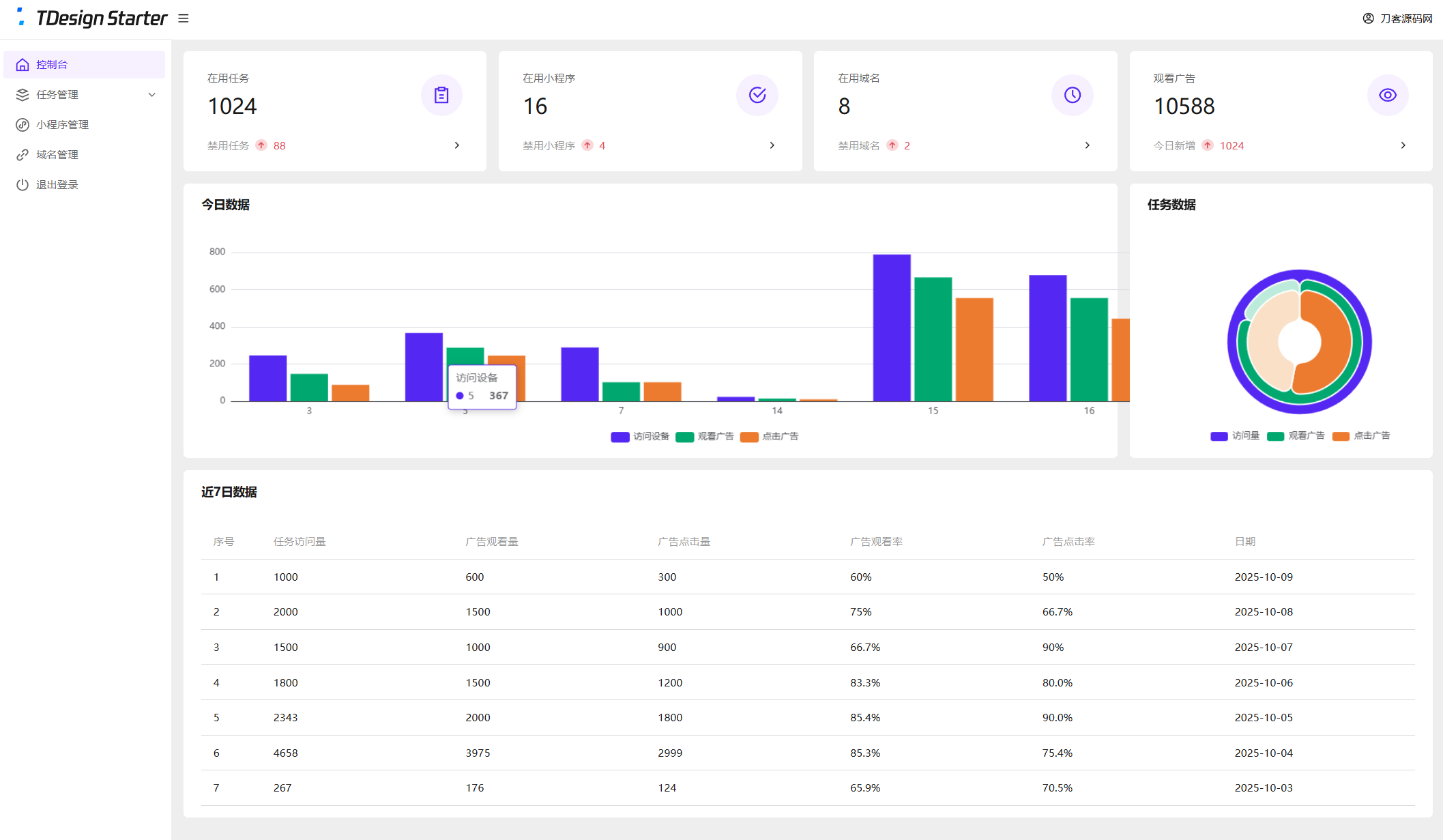 全新流量广告变现系统源码 任务管理系统 开源站长KING1个月前更新关注私信08314 简介: 全新流量广告变现系统源码 任务管理系统 开源 项目结构: 接口管理:PHP + Mysql 后台管理系统:Vue3 + ts + TDesign 任务单页:Vue3 小程序:uniapp + Vue2 变现说明: 基础流程: 后台创建任务 复制任务链接 分享到社群或私域 用户打开任务页面 跳转到小程序观看广告 观看广告 下发奖励: 收入来源 微信小程序官方广告收入 其他收入 图片: © 版权声明文章版权归作者所有,未经允许请勿转载。THE END网赚资源 喜欢就支持一下吧点赞14 分享QQ空间微博QQ好友海报分享复制链接收藏